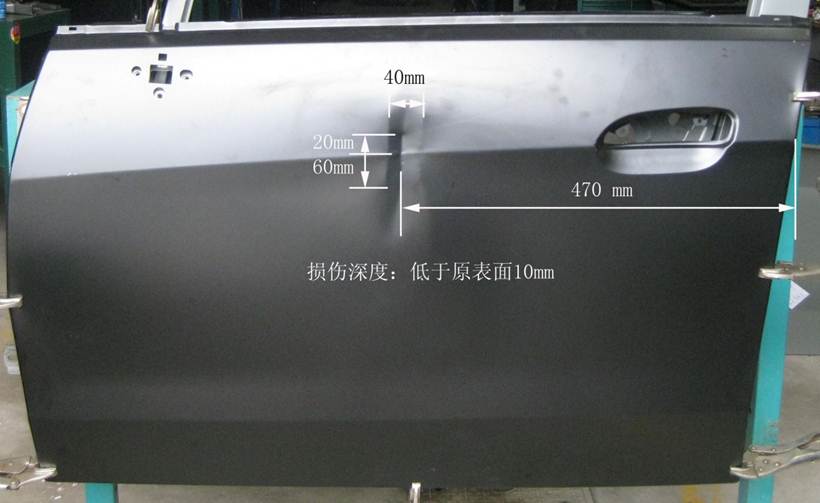 2013年車身修復大賽受損門板修復項目技術方案的補充說明 2013-05-16 18916 2013年車身修復大賽受損門板修復項目技術方案的補充說明 1、受損門板項目的受損位置及尺寸圖片、作業(yè)要求(1)作業(yè)要求在40分鐘內,對雪佛蘭新賽歐左前門外板上的長80mm,寬40mm,深10mm的條形凹陷(漆膜已破壞)進行修復,凹陷損傷穿過車身線。