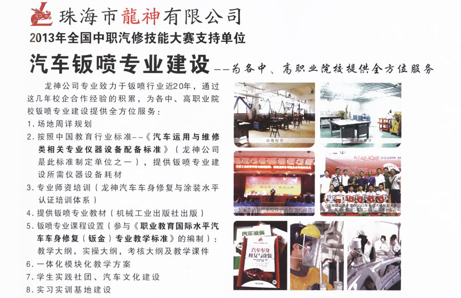 龍神汽車車身修復與涂裝 水平認證培訓體系 2013-06-03 25134 龍神公司專業(yè)致力于鈑噴行業(yè)近20年,通過這幾年校企合作經(jīng)驗的積累,為各中、高職業(yè)院校鈑噴專業(yè)建設提供全方位服務。