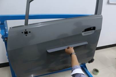 在40分鐘內(nèi),對(duì)雪佛蘭新賽歐左前門外板上的長(zhǎng)80mm,寬40mm,深10mm的條形凹陷(漆膜已破壞)進(jìn)行修復(fù),凹陷損傷穿過車身線。