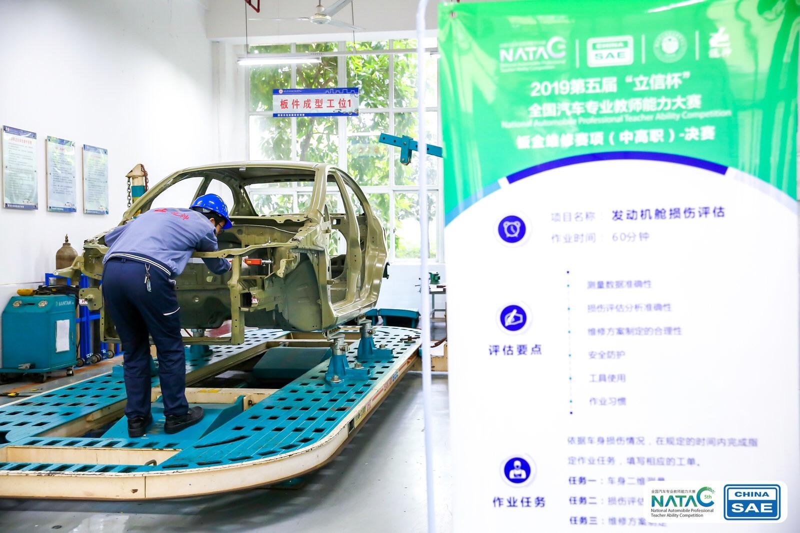 此次鈑金維修賽項分為N進(jìn)36的選拔賽(微課制作)、36進(jìn)4的預(yù)賽(項目是信息化教學(xué)說課、鋼制板件維修、模擬前縱梁更換維修)、決賽(項目是發(fā)動機艙損傷評估、信息化教學(xué)現(xiàn)場授課)。